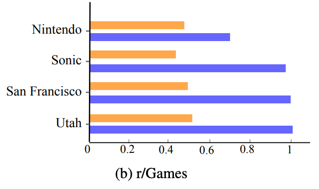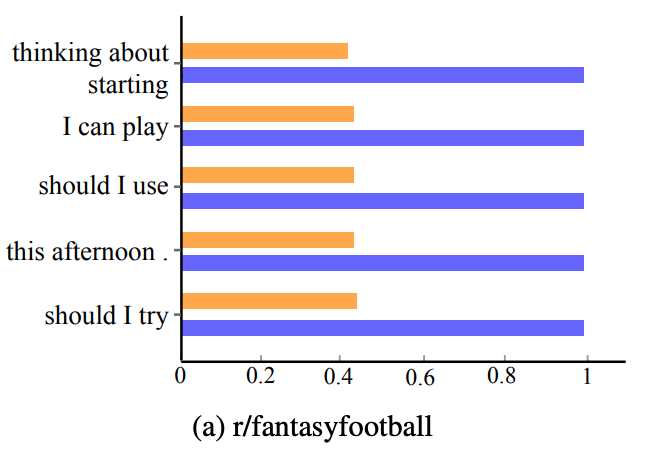 Figure 3: Representative terms with large score differences between subreddit-specific scores (blue) and average across subreddits (orange) for r/fantasyfootball and r/Games.